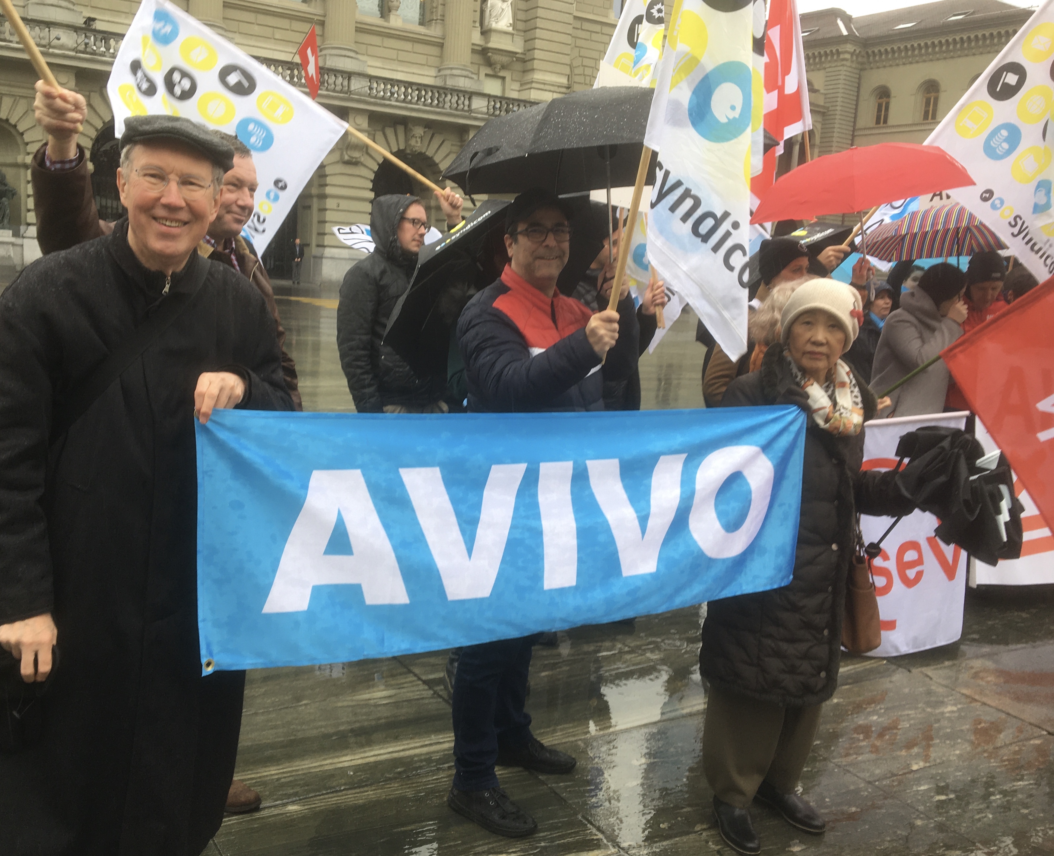Gestern fand auf dem Bundesplatz eine kleine Demo statt, an welcher auch wir vertreten waren. Das Initiativkomitee, worin die AVIVO von unserer Schweizer Präsidentin Christiane Jaquet vertreten ist, wird von einem breiten Bündnis unterstützt. Spätestens am 17. März 2020 werden Sie mit unserer Post den mit einem AVIVO-Signet versehenen Initiativbogen erhalten. Schon jetzt erhalten Sie den Unterschriftenbogen des Schweizerischen Gewerkschaftsbundes, welchen Sie ausdrucken können (Beilage, siehe auch www.sgb.ch/themen/sozialpolitik/detail/initiative-fuer-eine-13-ahv-rente).